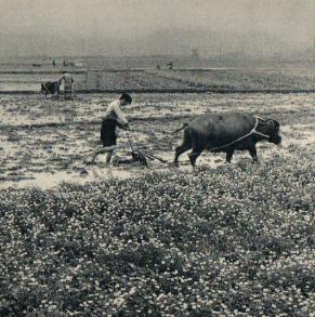红花草是一种很好的绿肥作物。从前,却有人给下了“定论”,说红花草在五岭以南不能生长。广西壮族自治区几年来积极进行科学试验,通过不断实践,试验成功,并开始大面积种植。这是容县东光公社社员正在翻压红花草。(谭志强摄影《民族画报》1966年第2期)