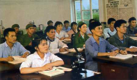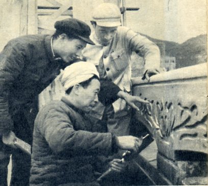 市内原来只有三个小工厂,现在已经新建了发电、农具、制药、丝织等7个工厂。丝织厂年产绸缎178000公尺。这是缫丝工人。