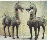 东汉铜马。1981年徐水县房陵村出土,形体高大。左一匹高115厘米,右一匹高112.7厘米。形体显得比西汉铜马更为劲健,具有“天马”的特征。