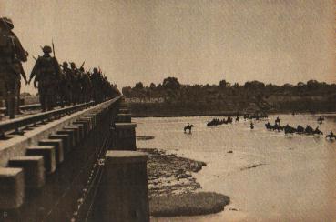 日军冈本(保)部队正在渡过定兴的大铁桥,向徐水发动进攻。(1937年9月20日,日军随军记者拍摄)