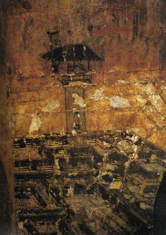 逯家庄东汉汉墓壁画《庭院建筑》。1971年发现,画面230厘米,宽135厘米。这是图中的庭院部分。