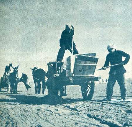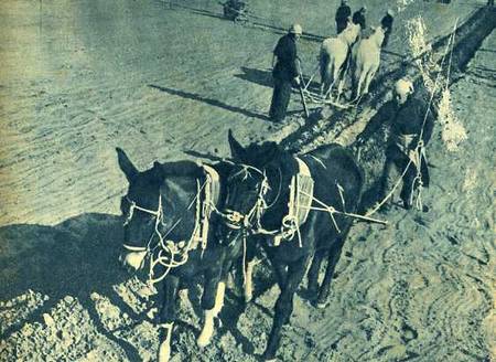 春耕季节到了,全社使用8、9匹肥壮的骡马,拖着10寸大犁,在大片土地上耕地,耕得又深又宽。