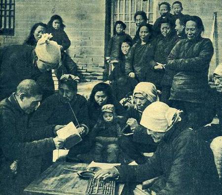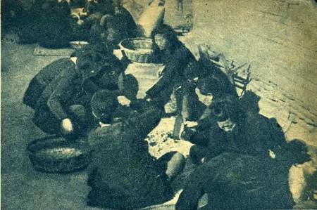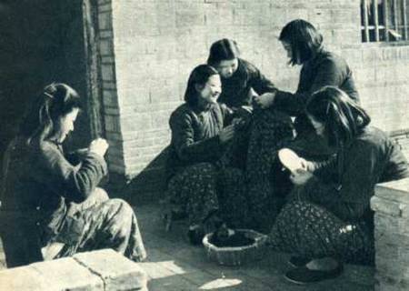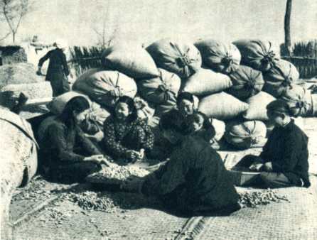 耿长锁农业生产合作社的妇女也组织起来了。一部分整劳动力组成小组,与男工同样从事农业生产上的劳动,半劳动力作一些零碎农活,这样,一年中就可节省男劳动力925个工。这是妇女们在选棉花和花生的种子。