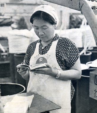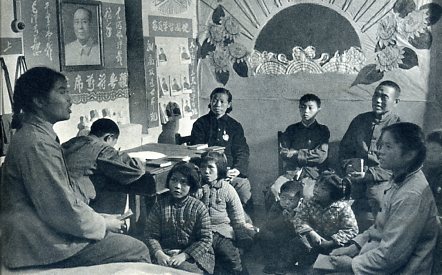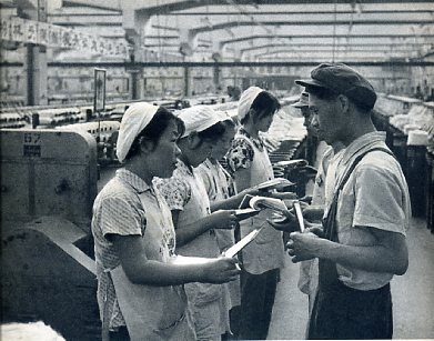 对下一班是用毛泽东思想交班,在本班内是一帮一,一对红。大家在政治上、生产上、生活上都互相帮助。这是细纱车间的几对一对红的工人在一起学习。