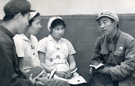 用毛泽东思想交班,就是以斗私批修为纲,在交班记录上用毛主席的教导,严格检查自己,尽力帮助别人。这是工人们在向解放军请教,怎样才能更好的帮助别人。