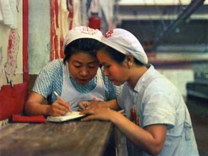 工人林书蕊和苏小珍,在用毛泽东思想交班中,互相启发,互相帮助。