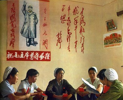 石家庄市的工人阶级无限热爱毛主席,这是国棉二厂女工在绣毛主席像。