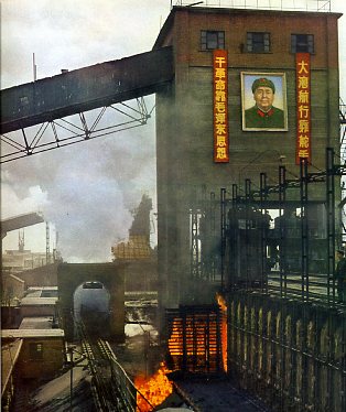 火车站的十八个装卸工人,在毫无设计和加工经验的情况下,凭着对毛泽东思想的无限忠诚和为毛主席争光的热情,仅用这样一个红炉和两只老虎钳,自行设计制造出了这台起重十五吨的龙门吊车。