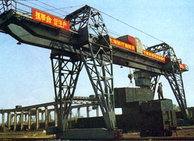 自行设计制造的起重十五吨的龙门吊车。
