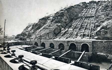 全区已建成扬水站、水轮泵站等四千三百多处,使大量山坡、丘陵耕地得到灌溉。这是平山县大吾公社的水轮泵扬水站。