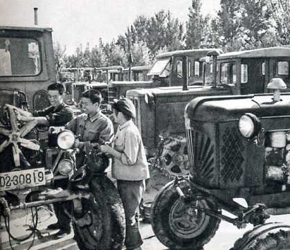 全区已经形成县、社、队三级农机修造网。百分之九十二的公社和三分之二的大队建立了农机修造站。这是束鹿县中里厢公社农机修造工厂工人在维修拖拉机。