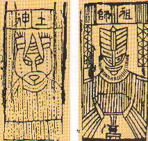 纸马《土神》和《祖师》。“纸马”亦称“甲马”、“神马”、“灶马”。它反映了人们对“自然神”、“社会神”的崇拜和祈祷。在我国,纸马各地都有,只是艺术形式和风格有所不同。