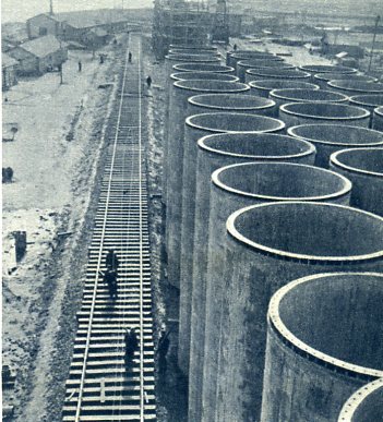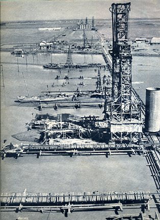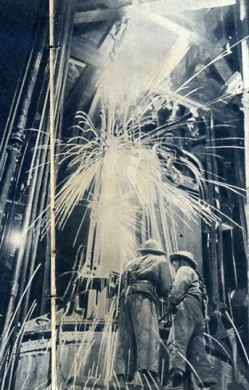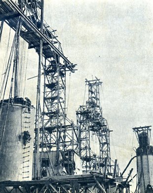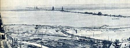 北京—广州铁路复线上横跨黄河的大桥正在施工。这一带河床变化多端,利用船只施工有困难,工人创造了水上栈桥和龙门架,使工程得以顺利进行。