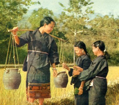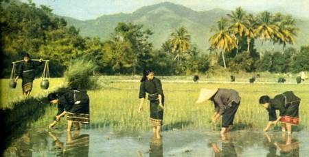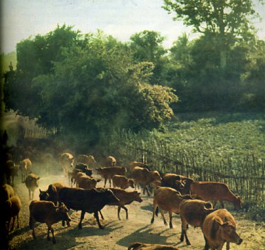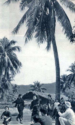 海南岛乐东县尖峰人民公社登司村的一角。社员们休息时在一起唱歌跳舞。