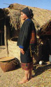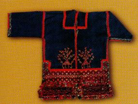 黎族传统女服。乐东县抱由地区侾黎女服装饰风格粗犷豪放,青蓝色麻布制作,无领对襟式,宽大,前襟长,袖短。通身镶饰红布条和刺绣,下摆缀穗和铜质蛙铃,该蛙铃造型抽象而传神。