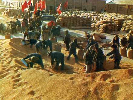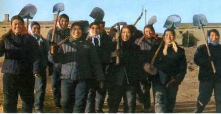 在毛泽东思想哺育下,在铁人精神鼓舞下,大庆油田的家属担负起油田的农副产品和生活服务的绝大部分任务,有力地支援了油田的建设,这是家属们在下地生产。