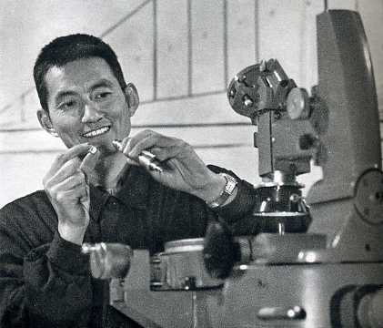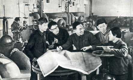 技术人员周希清(右三)为了改进脱水器结构,降低净化油含水量,成年累月和工人一起同吃同住同劳动。