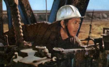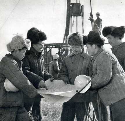 大庆工人阶级的杰出代表“铁人”王进喜(左),当年和钻井队员一起,艰苦创业,为开发大庆油田英勇奋战。