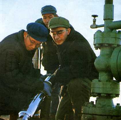 一二0二钻井队的前队长屈清华(中)被群众赞为学习“铁人”精神的带头人。他已被选拔为钻井指挥部党委副书记。