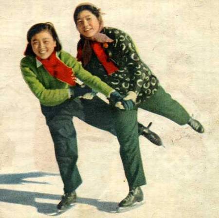 电机系的女生杨文彦(左)和晋晓林(右)是溜冰健将,她们经常出现在溜冰场上。