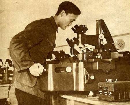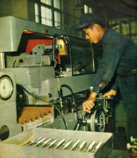 工具车间已经开始生产。技术徐宏善在螺丝磨床旁工作。