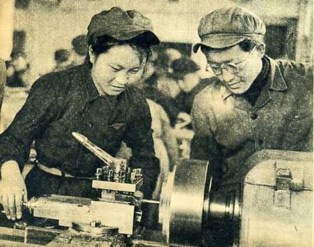 附属技工学校的学员吴凤芝(左)在实习工厂里实习。