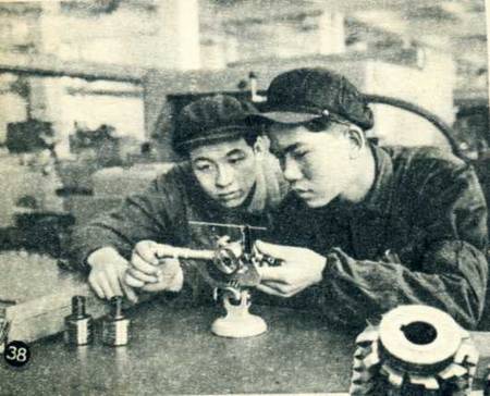 技工侯玉荣帮助工人石玉财检查他所制造的(螺丝塞规)。