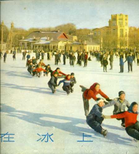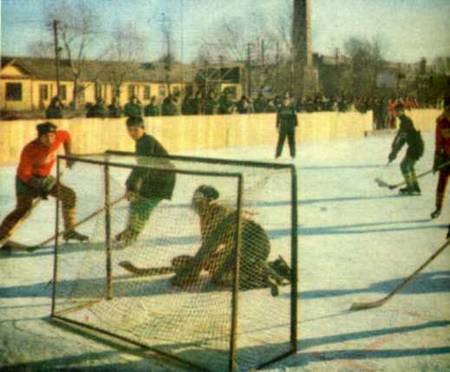 哈尔滨机车车辆修理工厂工人冰球队和市冰球代表队在厂内冰场上作友谊赛。