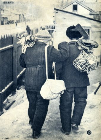 傍晚了,松花江上滑“爬犁”的人还舍不得回去(爬犁是类似雪橇的一种运动器具)。