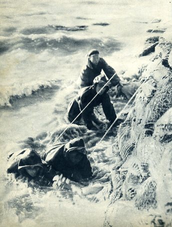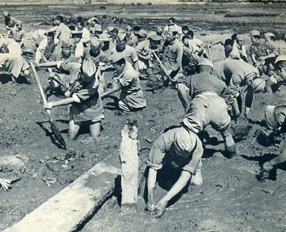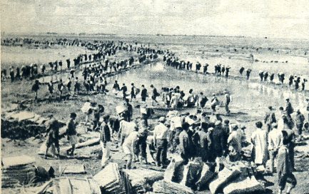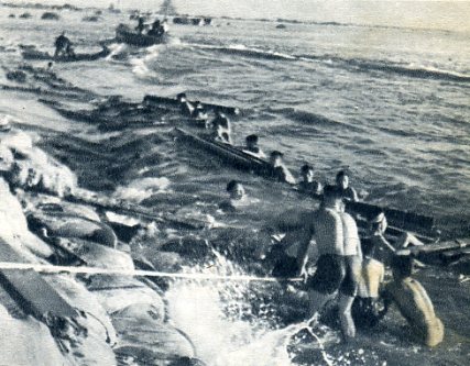 哈尔滨机车车辆修理厂工人在水中坚持了16小时的扛土抢险工作。