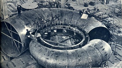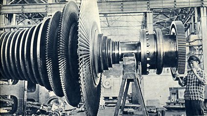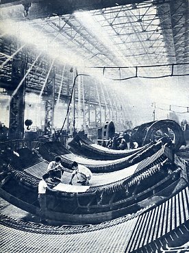 比火车头大好几倍的72450千瓦水轮机的涡壳,躺在电机厂车间里,就象巨大的蜗牛一样。