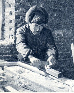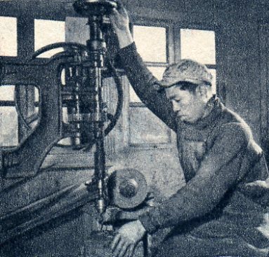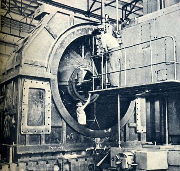 给5万千瓦汽轮机的后汽缸加工时,人和机器不得不钻进去工作。