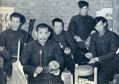 木匠王文举(左起第三人)喜爱铙钹,烧窑工李树洞(左起第二人)大敲木鱼。
