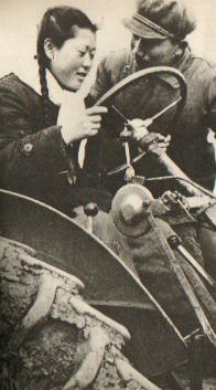 宾县居仁公社出了个“铁姑娘”李真分。这位刚满19岁的姑娘,去年365天,除去开会占用了48天外,还做了505个劳动日,一个人几乎干了两个人的活。图为李真分在向拖拉机手学习拖拉机各部件性能和排除故障的方法。(1959年)