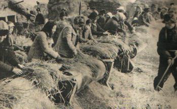 在党的“全党全民动手,大办农业、大办粮食”的伟大号召下,哈尔滨市各个战线上的红旗手、青年们纷纷向党申请,要求到农业生产第一线去。他们共751名青年,带着发愤图强、艰苦奋斗、建设美好幸福的农村人民公社的共同愿望,带着火热的心,到通河县浓河公社安家落户。图为他们放下行李就投入了打场战斗。(1961年)
