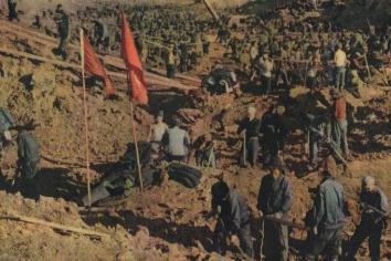 鹤岗人民公社工农商学兵,热烈投入大搞煤炭的群众运动。在纵横二十平方公里的两大露天煤矿的工地上,二十五天内,挖土70多万立方米。(1959年)