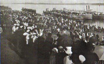 黑河镇对岸的海兰泡港。1900年7月9日,沙皇尼古拉二世宣布自任总司令,由陆军大臣库罗巴特金任总参谋长,集结了10余万俄军,分兵七路,大举侵入中国东北地区。他们首先把大批军队集中在黑河镇对岸的海兰泡。海兰泡原名孟家屯,本是黑龙江省瑷珲县的一个中国港口和村镇。根据1858年签定的不平等《中俄瑷珲条约》,被沙俄强行划走,改名布拉戈维申斯克,成为俄国阿穆尔州的首府。