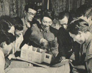 公社党委陈书记和县卫生工作干部、哈尔滨医科大学的同学们共同设计连屋式厠所。