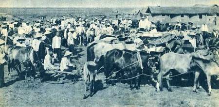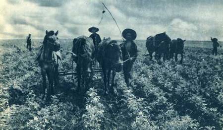 东北讷河县六区聚合村村干部和村的党支部动员全村40多付犁杖帮助移民开荒。