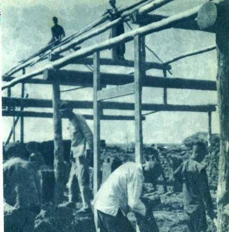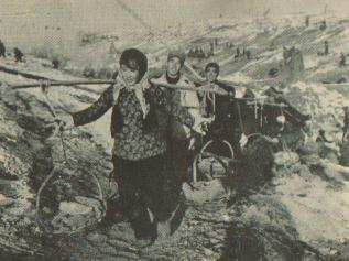 “夫妻双双来工地,来往穿梭快似飞,看谁担的多又快,互相竞赛比高低。”讷谟尔河发源于小兴安岭的山口,从东向西顺流而下,流入嫩江。全县人民在党的领导下,要将讷谟尔河大搬家,把河水引上高山灌溉农田。他们要在平地开凿长达634里的“山上卫星运河”。是黑龙江省已经动工兴建的最长运河之一。这条运河起于北安县境内的突泥浅,流经克山县北部,横贯讷河县境内八个公社,最后流入依安县乌裕尔河。(1959年)