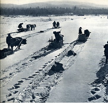 东北铁力林区参加检修森林铁路的工人们。