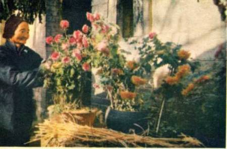 现在有很多社员喜欢养花,这个施老太太用草把花茎包起来,保护他们过冬。