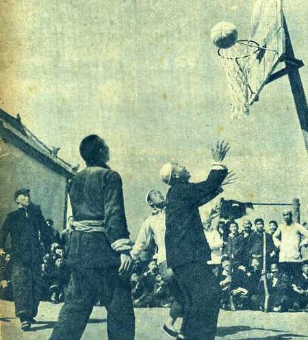 平原省林县的农民们,结合生产劳动,广泛开展体育运动。图为该县下申街村的农民在比赛篮球。
