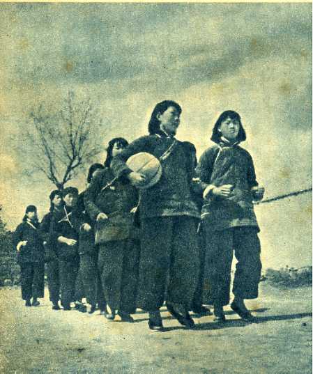 林县李家庄妇女篮球队的队员们整队往球场参加比赛。