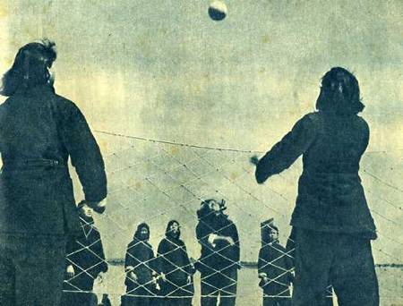 “球过来了,赶快打过去”林县李家庄妇女排球队在练球。
