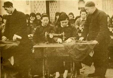 平原省林县为了节省农村妇女的劳动力,扩大生产,举办了缝纫机训练班,由该县各村选派妇女参加学习。第一期45名学员已于3月21日毕业。她们将分别回到原村,以机器来代替从前村中妇女们的手工缝纫工作,使大部妇女的劳动力可投向农业和其它副业生产。图为训练班的学员在向技师学习缝纫机的操作方法。(1952年)