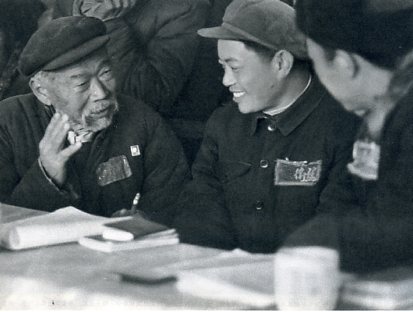 八十六岁的老饲养员肖位芬(左一)对新成立的县革命委员会爱护备至,他经常向革委会的委员们反映群众的意见。
