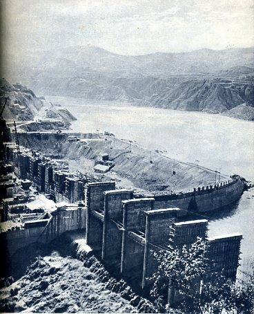 黄河三门峡水利枢纽工程,经过两年多的施工,今年已发挥了部分拦洪的作用。7月间,当1万多秒立方米的洪水通过这里时,流量几乎被它砍掉上半。现在,大坝正在高出最大洪峰8米多的围堰保护之下继续施工。(1959年)