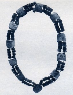 这是一座墓内死者佩戴的项链和其它装饰品的出土情景。上面是项链,中间是披在胸、腹部的串珠,下面是放在棺盖上的串珠。