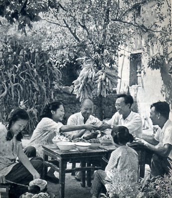 辉县高庄人民公社新庄大队是张履鹏的试验基点之一,这几年这个大队种植新谷种,获得丰产。图为秋收后,张履鹏和社员们共尝新米。